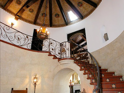 • 2-story grand entry with sweeping wrought iron circular staircase and stenciled beams.