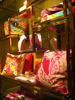 Towards the back of the store were two display shelves with the hot side and the cool side. This is the hot side showing off lovely pink and coral colored pillows from Trina's home collection. The plush pool towels and bright tropical punch colored bikini's subtly hinting its swim wear season.
