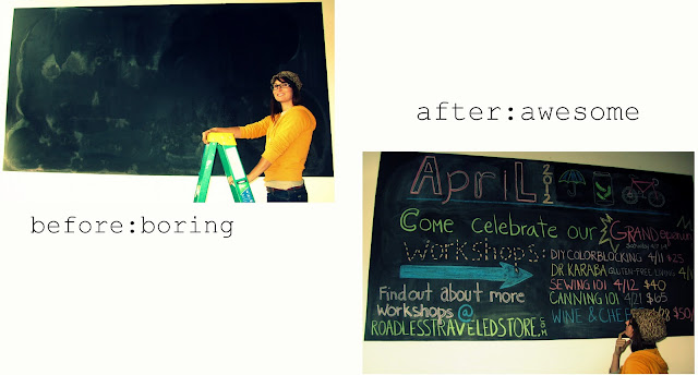 Hey everyone, If you have been to the road less traveled store than you have surely seen our massive chalkboard wall near our craft/workshop area. This was one of the first DIY projects we took on when we moved into the new space at GCAC. Our chalkboard has been the perfect place for our monthly workshops to be displayed and it always looks awesome thanks to Leigh Slater, our chalk artists and program coordinator.